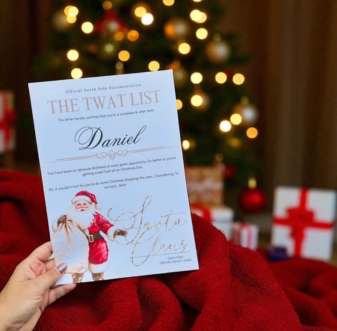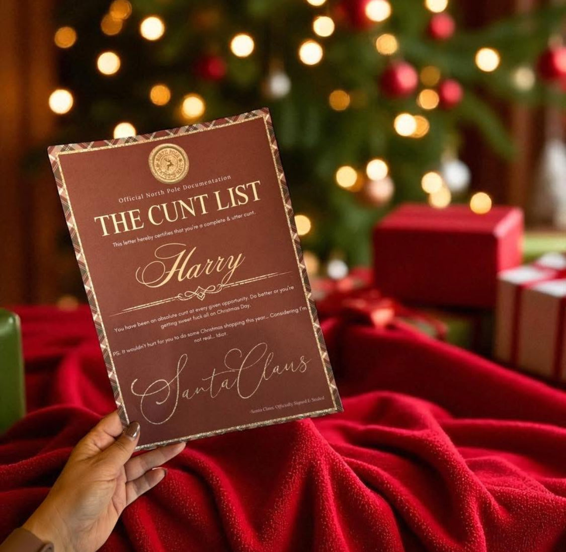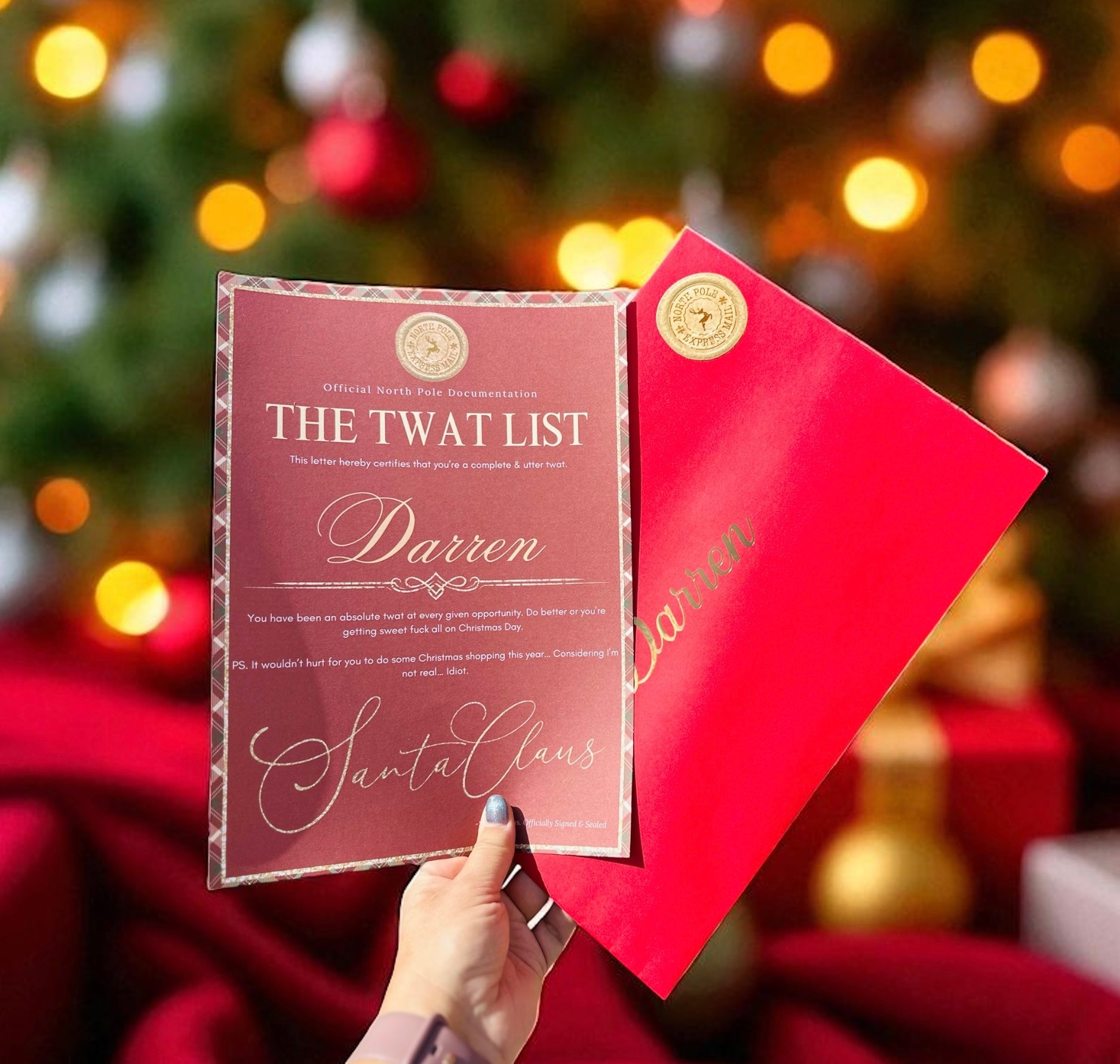 These A4 rude certificates feature two cheeky designs—classic red tartan and Santa with his sack—printed on sturdy 250gsm card. Each comes presented in a red envelope with a gold name and a shiny wax-seal style stamp, making them perfect for surprising your best friend, boss, partner, or secret Santa recipient with a mischievous laugh. Designed to bring a playful edge to gift-giving, these certificates combine quality presentation with bold humour.