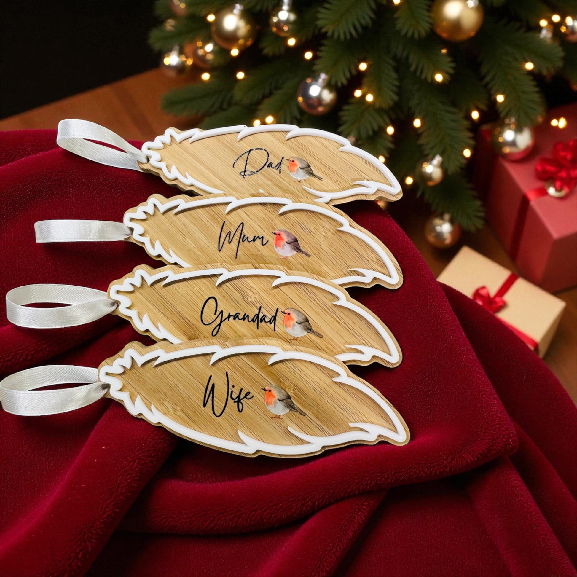 Stunning oak feather with an acrylic overlay, with a simple name (just let me know in the order notes) and a delicate robin decal. 13cm x 5cm and finished with a white ribbon. One supplied.