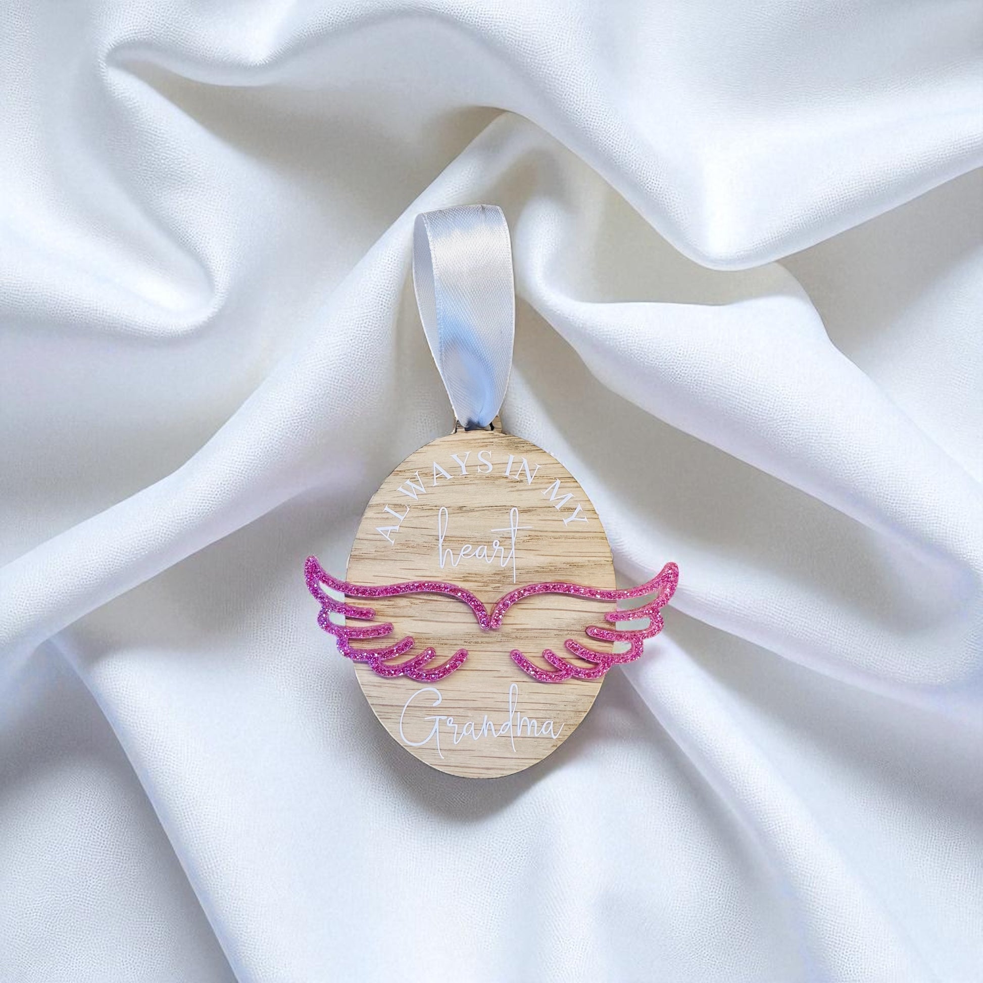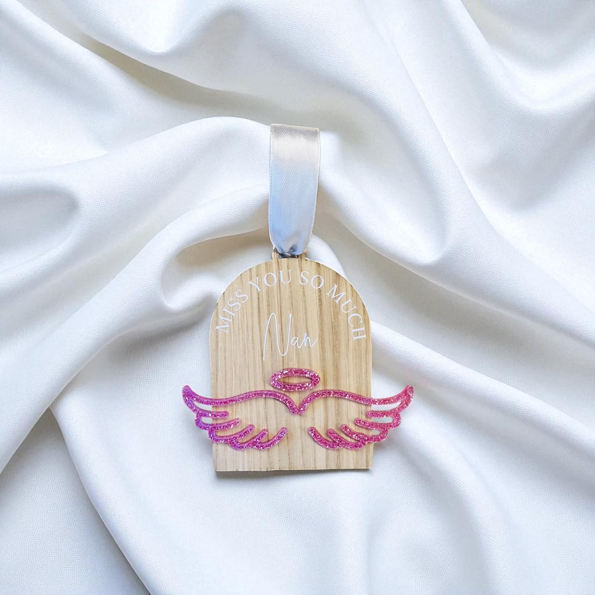Honour a loved one with the Oak Personalised Angel Wing Decoration. This 10cm keepsake can be personalised with your chosen name and features a delicate angel wing in either plain white, or blue, pink, or silver glitter. Available in arch or oval shapes, it comes finished with a white ribbon, ready to hang or gift. A touching and graceful way to keep cherished memories close. Please include your preferences in the order notes—for example, arch shape, “Mum,” and pink wings.