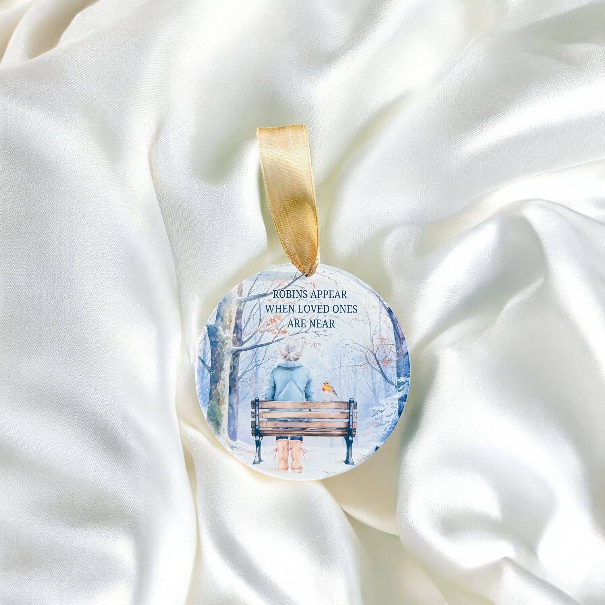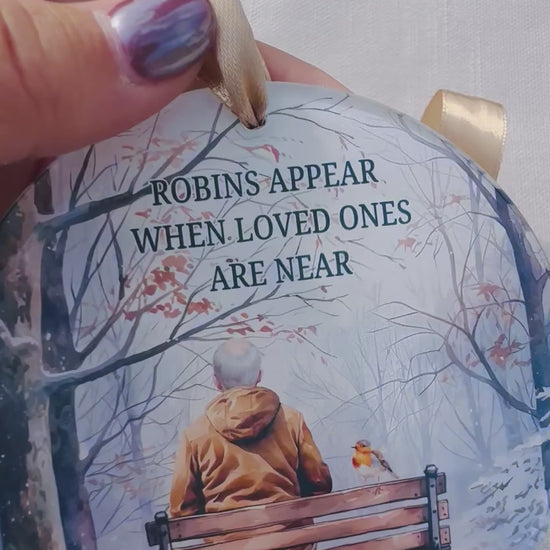 Robins Appear Bauble - Person on Bench - with clear gloss front