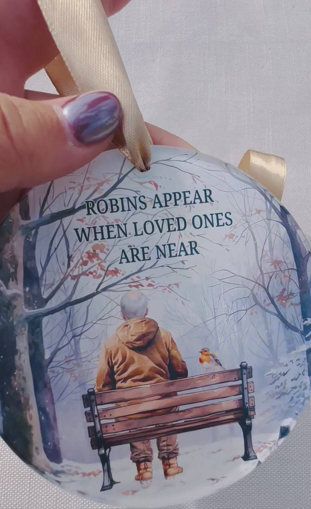 The 10cm Robins Appear Bauble features the option to choose a person to replicate yourself or a friend sitting on a bench in a snowy forest with a robin visiting. Crafted with a crystal-clear acrylic front and a matte-printed back that delivers a sophisticated glass-like finish. Have a look at the video to see just how beautiful these are. When illuminated by Christmas tree lights, its delicate shimmer is truly captivating. Finished with a gold ribbon for a classic look, this bauble is a stunning and unique addition to your Christmas decorations or as a gift for someone else.